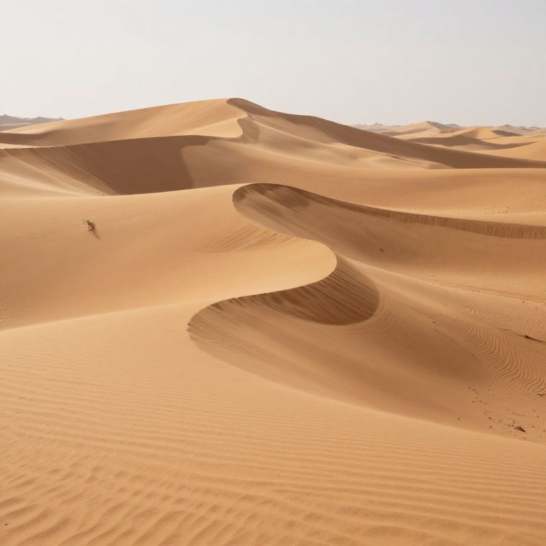 Photograph of a vast, sunlit desert with smooth, undulating sand dunes in warm orange hues, a small figure in the distance, and