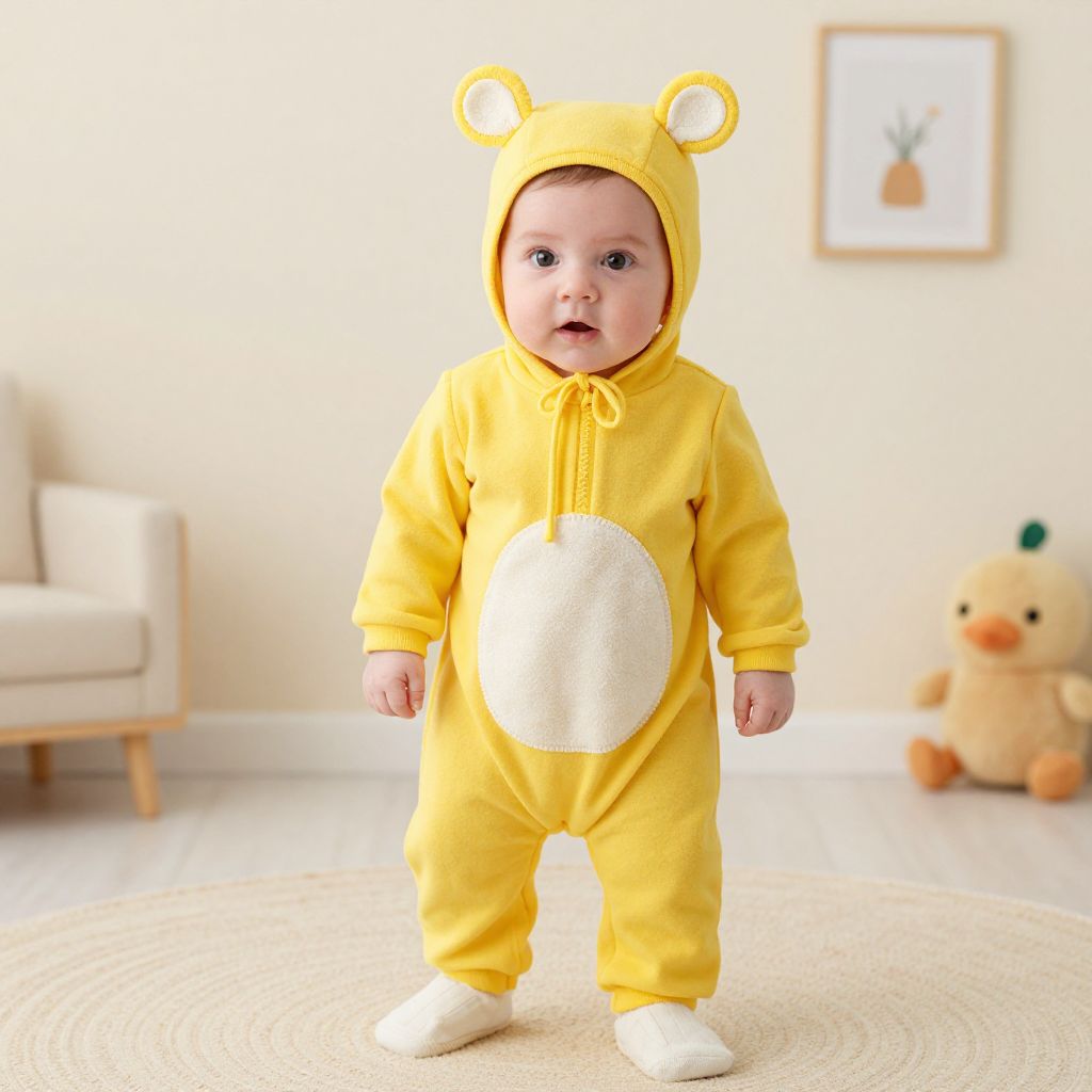 Photograph of a baby in a yellow bear-themed onesie with bear ears, standing in a bright, minimalist living room.