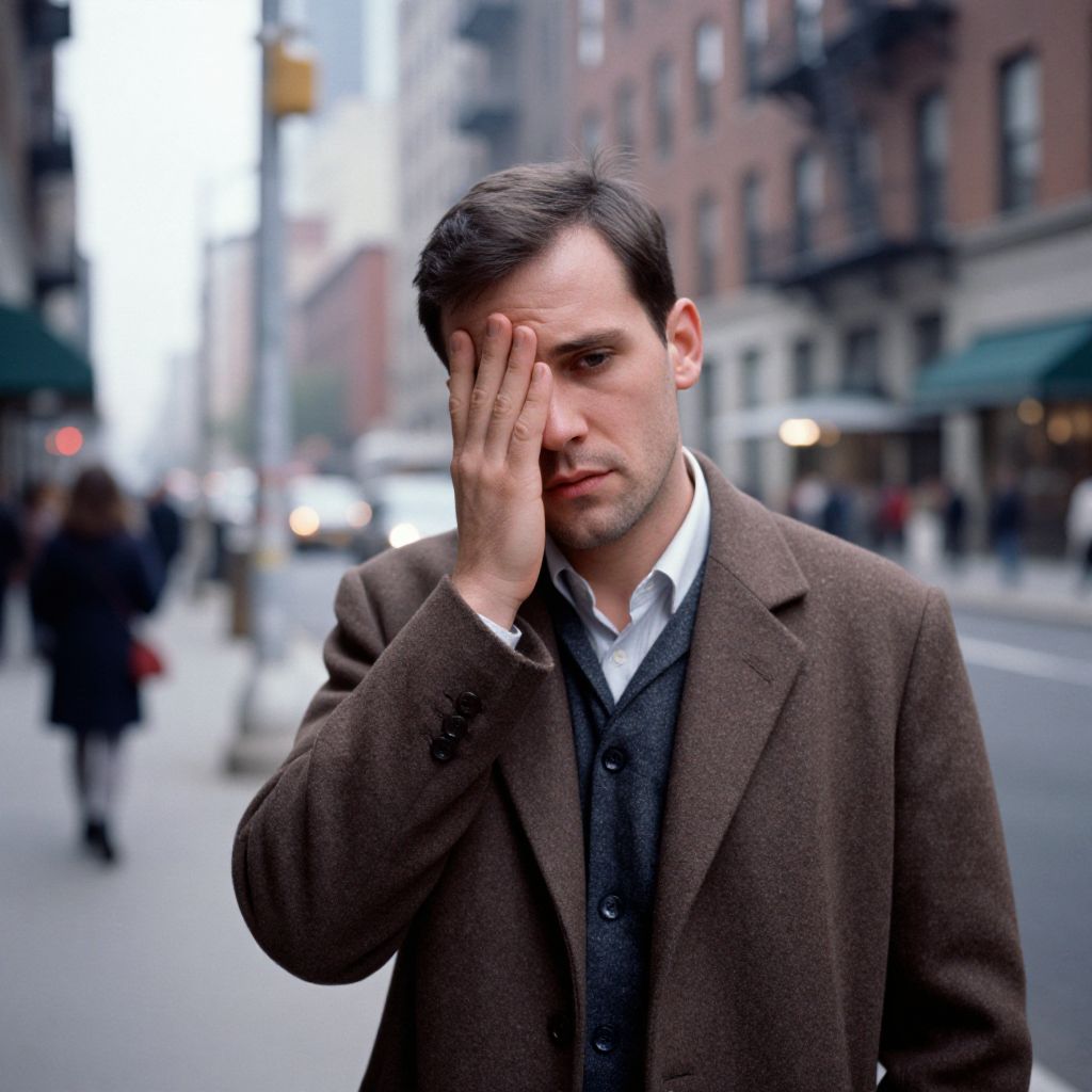 Photograph of a Caucasian man with short, dark brown hair, standing on a city street. He has a serious expression and is covering his forehead with his right hand. He wears a brown woolen coat over a white shirt and dark gray vest. The background shows an urban setting with blurred pedestrians, streetlights, and buildings, including a green awning and brick structures. The image has a shallow depth of field, focusing on the man while the background is out of focus. The lighting is natural, suggesting daytime.
