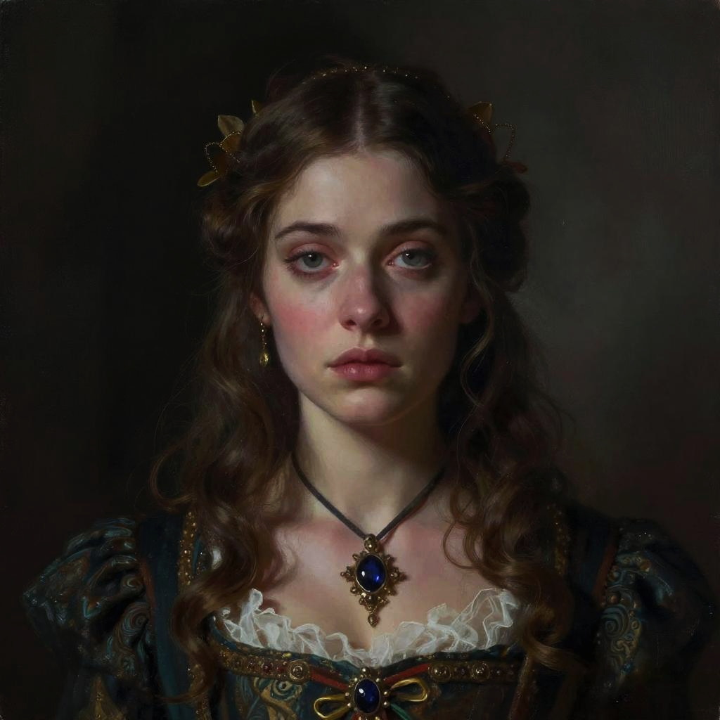 Tom Bagshaw art depiction of a melancholy woman with expressive eyes and elaborate costume, moody lighting with atmospheric depth, crisp digital brushstrokes, fantasy realism style