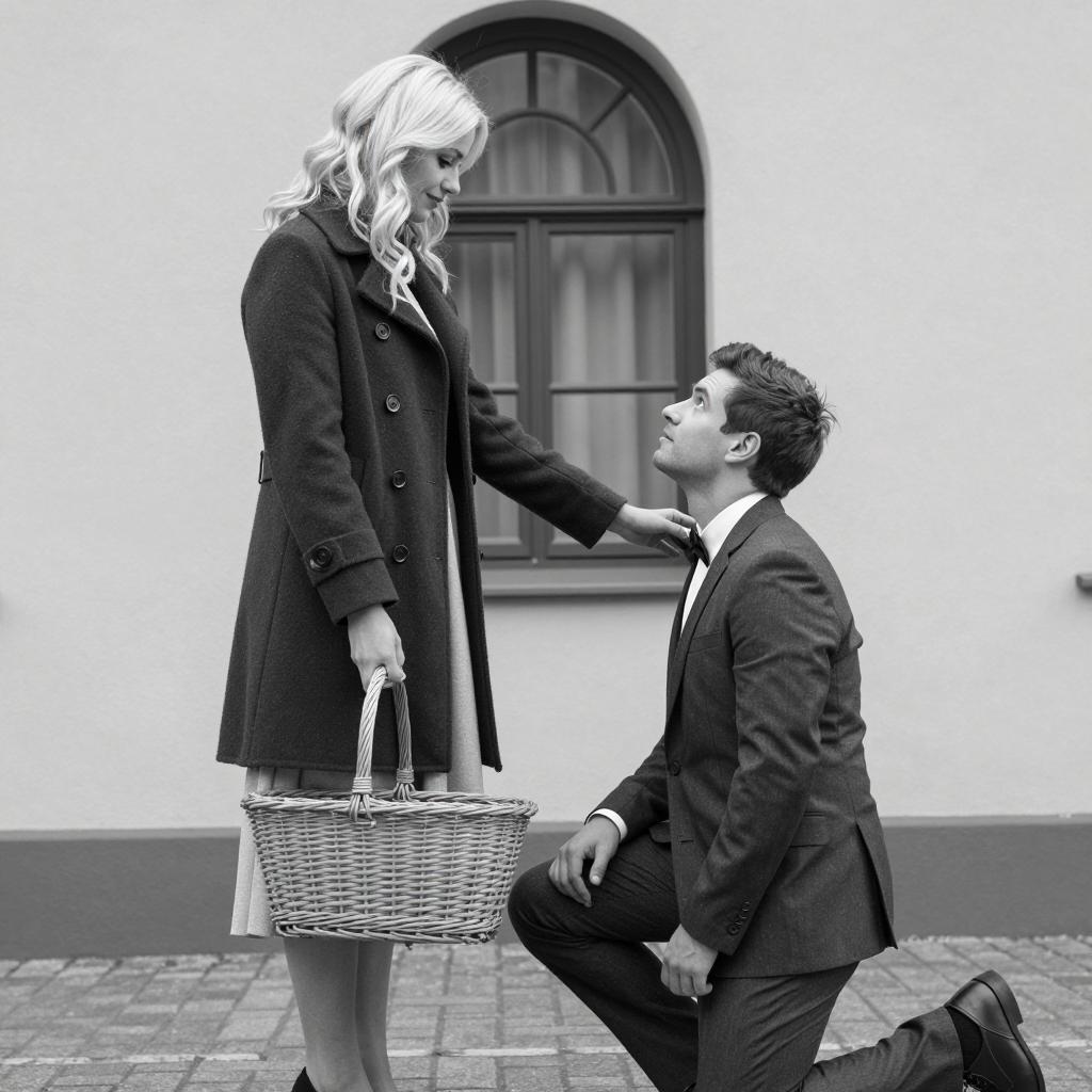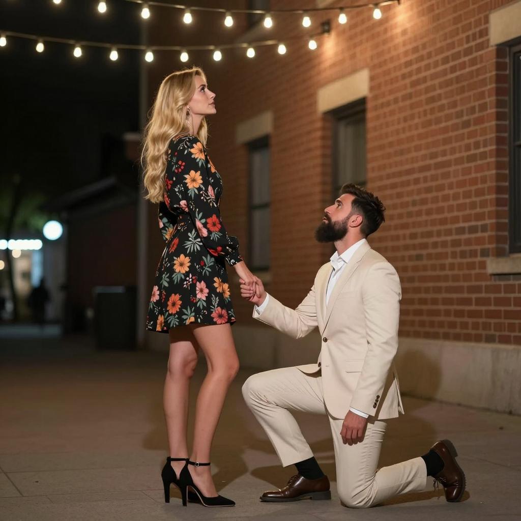 Blonde woman in floral dress and black heels, standing, holding hand of kneeling bearded man in cream suit. Both looking up. Illuminated string lights hang overhead. Nighttime urban setting. Shadow on brick wall. Background with blurred lights.