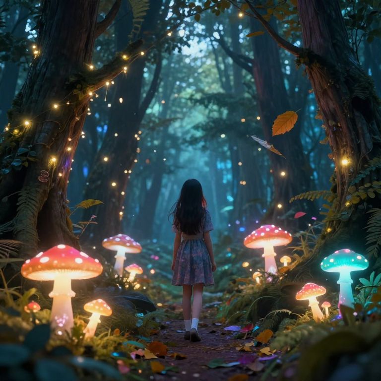 Takenoko no you exploring an ancient bamboo grove at twilight, a glowing bamboo shoot rises from the soil, a young girl with a lantern walks beside it, bioluminescent moss, ethereal glow, mystical ambiance, Japanese-inspired fantasy, cinematic composition, Dall-E style.