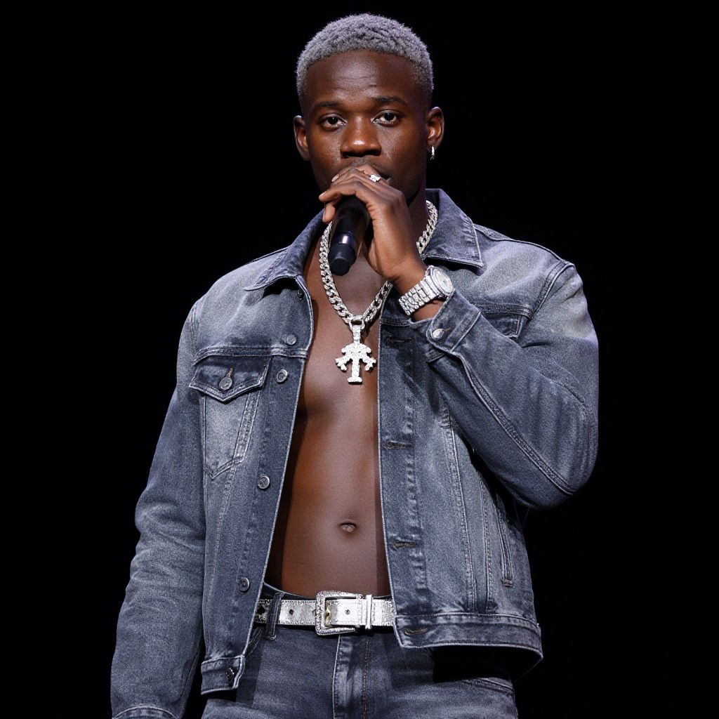 Concert outfit rap, 1boy, male focus, solo, jewelry, jacket, watch, necklace, dark-skinned male, dark skin, open clothes, wristwatch, belt, very short hair, grey hair
