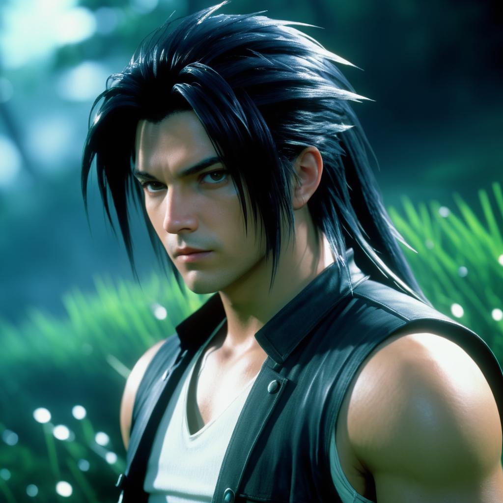 Final Fantasy VII character, close portrait with melancholic expression, serene nature background. Created by Tetsuya Nomura with cinematic lighting by James Gurney.
