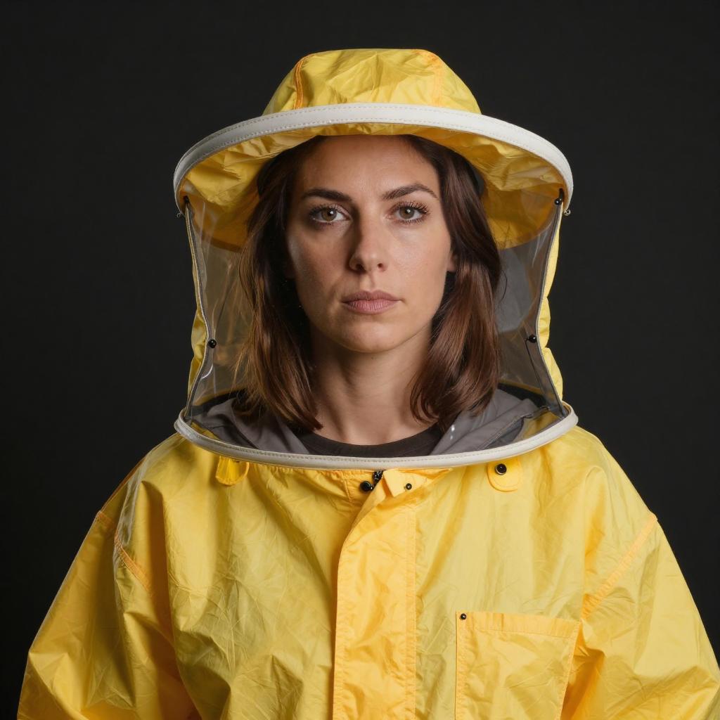 Portrait of a serious woman scientist with shoulder-length brown hair and athletic build wearing a yellow beekeeper protective suit and veil against a black studio background.