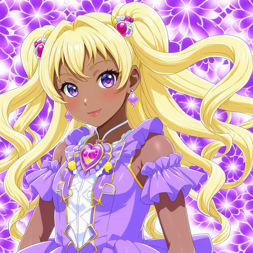 Amamiya elena, precure, 1girl, dark-skinned female, purple eyes, mole under eye, blonde hair, long hair, collarbone, earrings, by artist amane hasuhito, anime