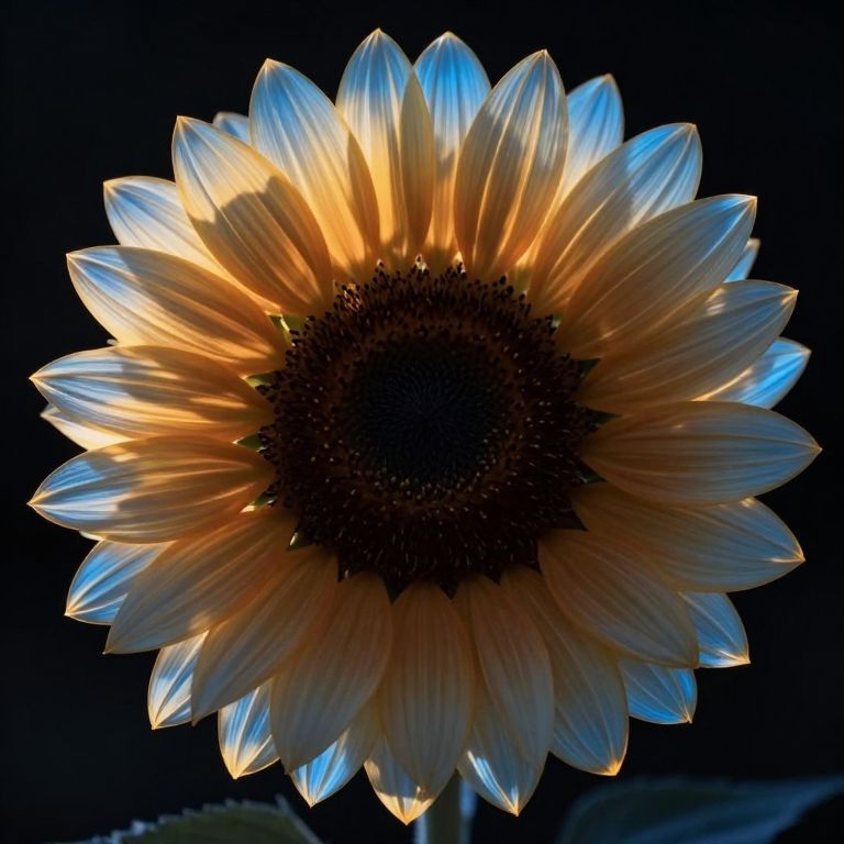 Eclipsed sunflower radiates ethereal light through translucent petals, alternating in amber and azure hues, as its dark core anchors the celestial bloom against a starless void.