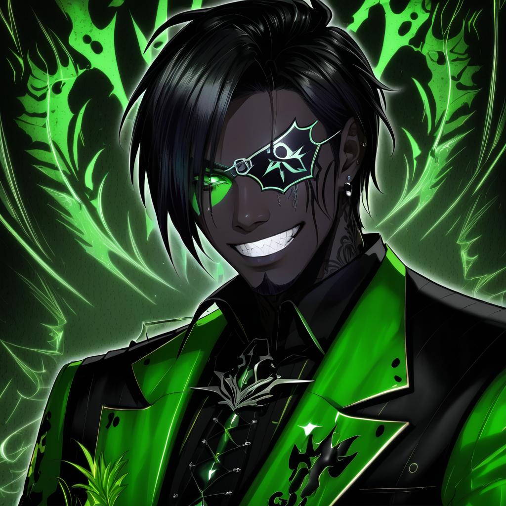 Aragami oga, holostars, 1boy, dark-skinned male, single horn, sharp teeth, green eyes, hair between eyes, hair over one eye, eyepatch, black hair, short hair, black gloves, virtual youtuber, virtual youtuber, by artist uenoryoma, anime