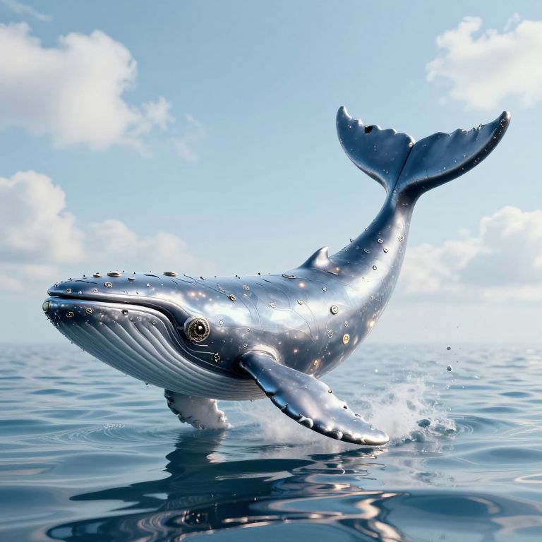 A cyberpunk-inspired 3D render depicts a clockwork whale with metallic fins gliding beneath a mirrored ocean surface, its reflective body capturing the dreams of those who have touched its tail, set against a serene sky with scattered clouds.