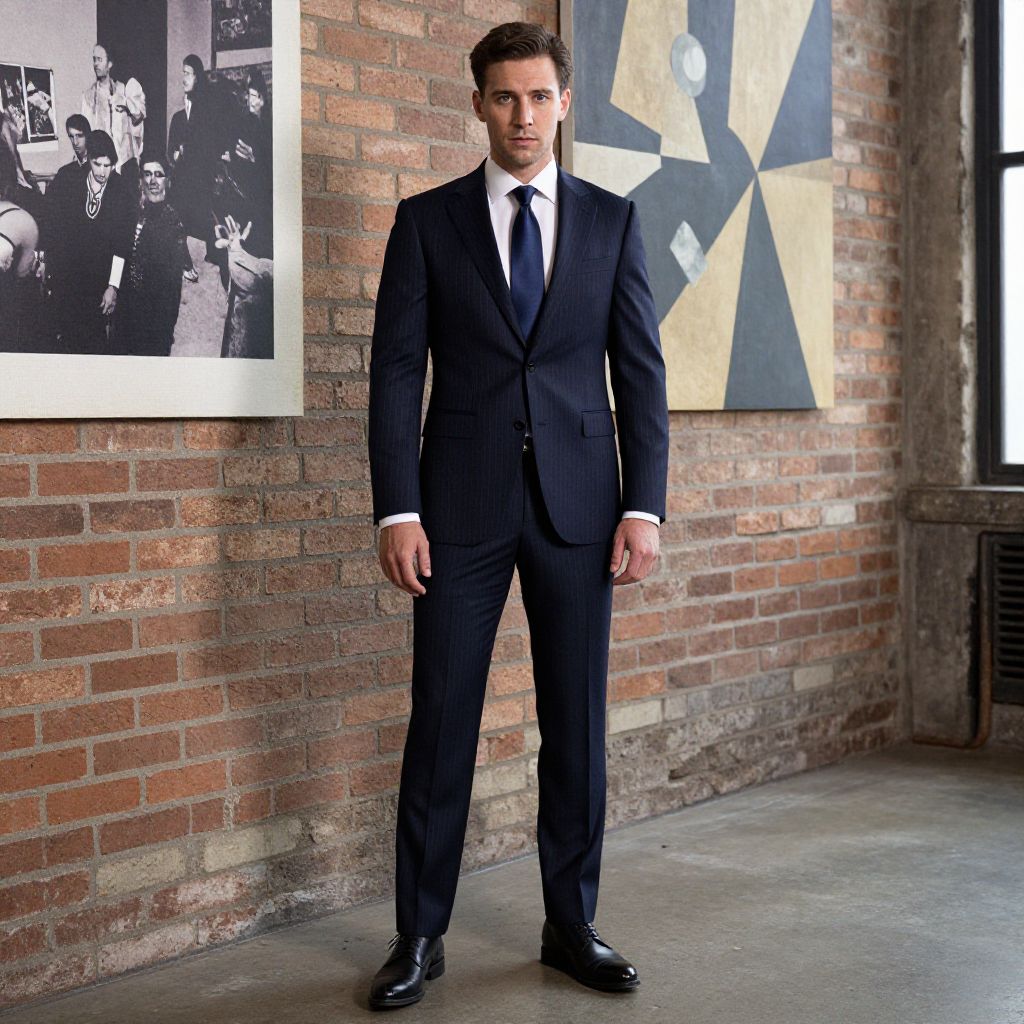 A man, navy pinstripe suit, tailored fit, crisp white dress shirt, silk navy tie, polished black leather oxford shoes, industrial loft, exposed brick walls, large abstract murals, vintage photo style, confident expression. Man has masculine face and piercing eyes