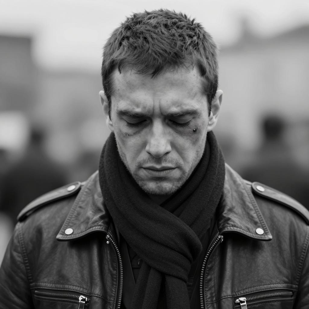 Black and white photograph of a man with short dark hair and closed eyes, looking downward with a pained expression. He has a black eye and a bruise on his left cheek. He wears a dark leather jacket and a black scarf. The background is blurred.