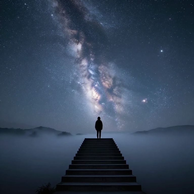 Twilight staircase ascends gracefully toward a starlit expanse, where a lone figure stands silhouetted against the Milky Way's radiant glow, surrounded by a sea of misty clouds below.