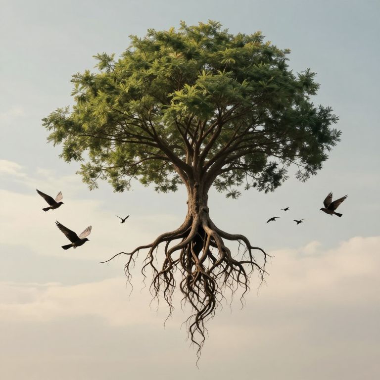 In a surreal inversion of nature, a tree sprouts from the heavens, its roots cascading like tendrils of memory, while birds soar with earthbound grace, embodying the eternal dance between freedom and groundedness.
