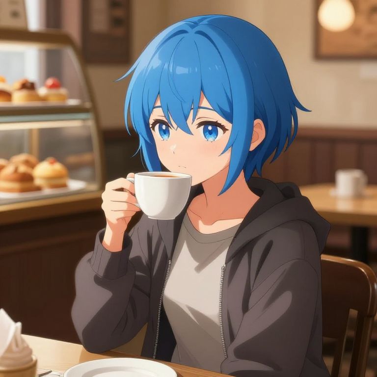 Short blue hair anime girl in a cozy cafe, sipping a cup of tea, warm lighting casting soft shadows, detailed background with pastries and books, realistic anime style with expressive eyes, casual modern outfit, relaxing atmosphere.