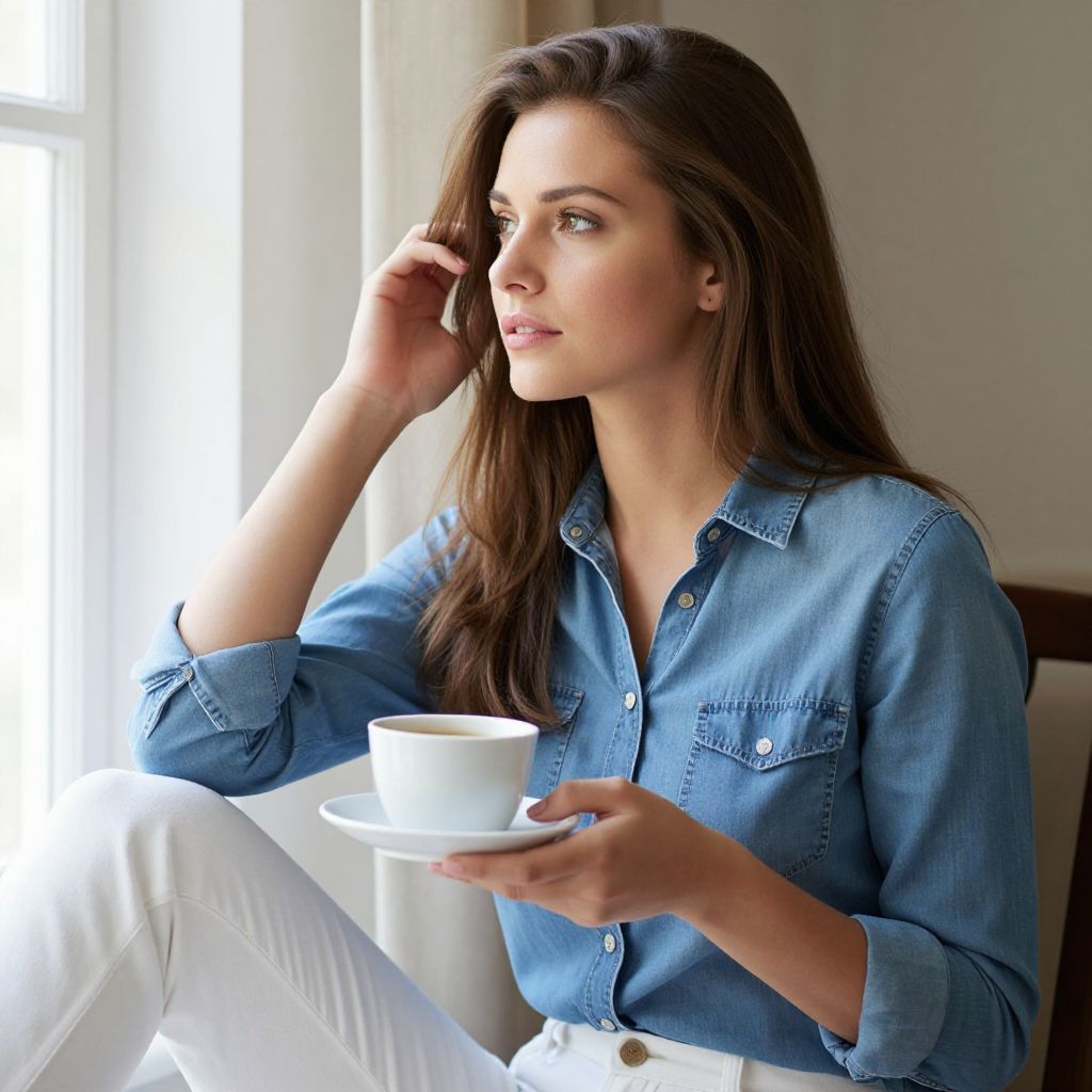 Photograph of a beautiful woman with long, straight brown hair, sitting by a sunlit window. She's wearing a blue denim shirt and white pants, holding a white cup and saucer in her left hand. Her right hand touches her hair, and she gazes thoughtfully outside. The background is softly lit, with beige curtains partially covering the window. The overall vibe is relaxed and contemplative.