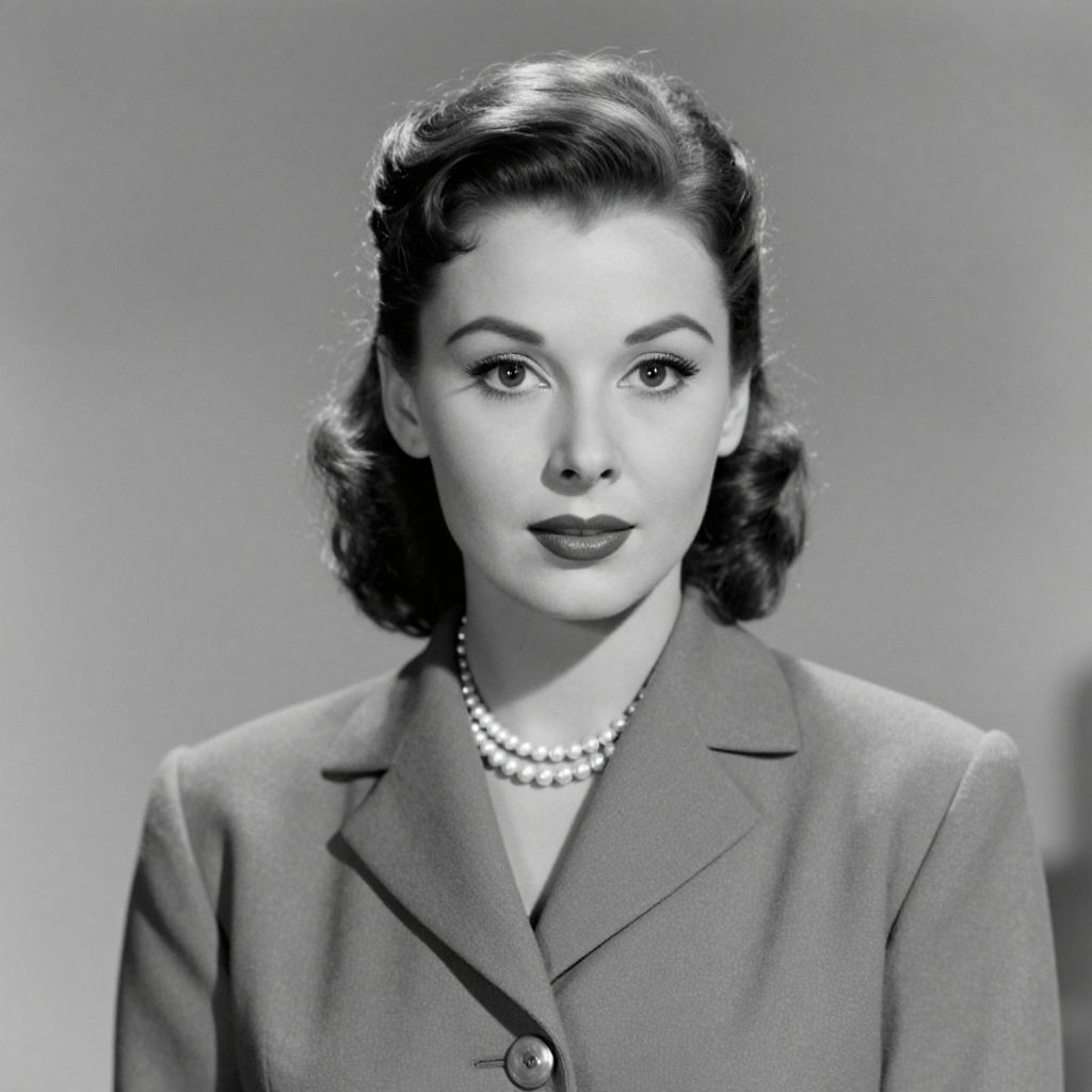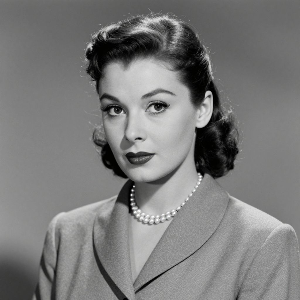 A vintage black-and-white portrait captures a woman in a classic 1940s style, exuding elegance with her meticulously styled hair, bold makeup, and a chic blazer adorned with a pearl necklace, reminiscent of the timeless glamour associated with stars like Gene Tierney.
