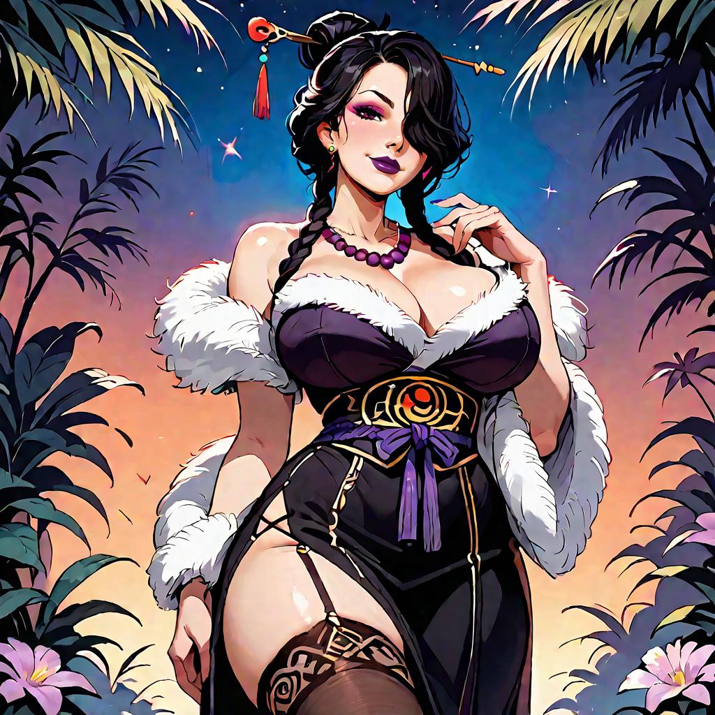 Score_9, score_8_up, score_7_up, score_6_up, score_5_up, source_anime, uncensored, , A girl is casting magic fire spell and throwing flames, hand up, Lulu (ff10), 1girl, mature female, solo, cowboy shot, looking at viewer, seductive smile, half closed eyes, mole under mouth, makeup, eyeshadow, purple lips, red eye, hair over one eye, hair ornament, hair stick, black hair, fur trim, single hair bun, one eye covered, multiple braids, jewelry, purple bead necklace, pearl necklace, bare shoulders, off-shoulder black dress, multiple belts, black thighhighs, lace thighhighs, curvy, huge breasts, cleavage, thighs, outdoors, jungle, starry sky, night