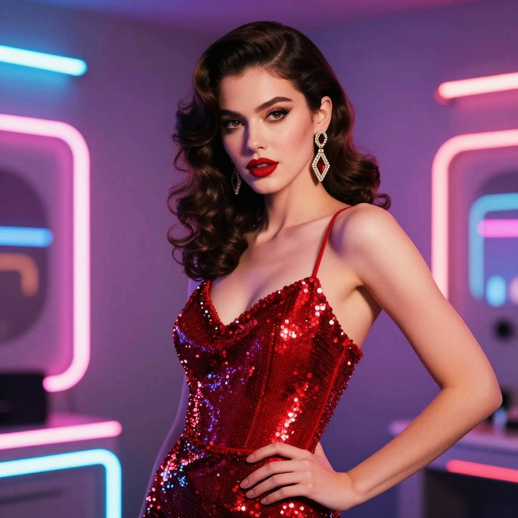 A glamorous woman with vintage wavy hair and elegant makeup stands confidently in a vibrant neon-lit environment. She wears a sparkling red sequin dress paired with intricate drop earrings, exuding a sophisticated retro-futuristic vibe with a cinematic style.