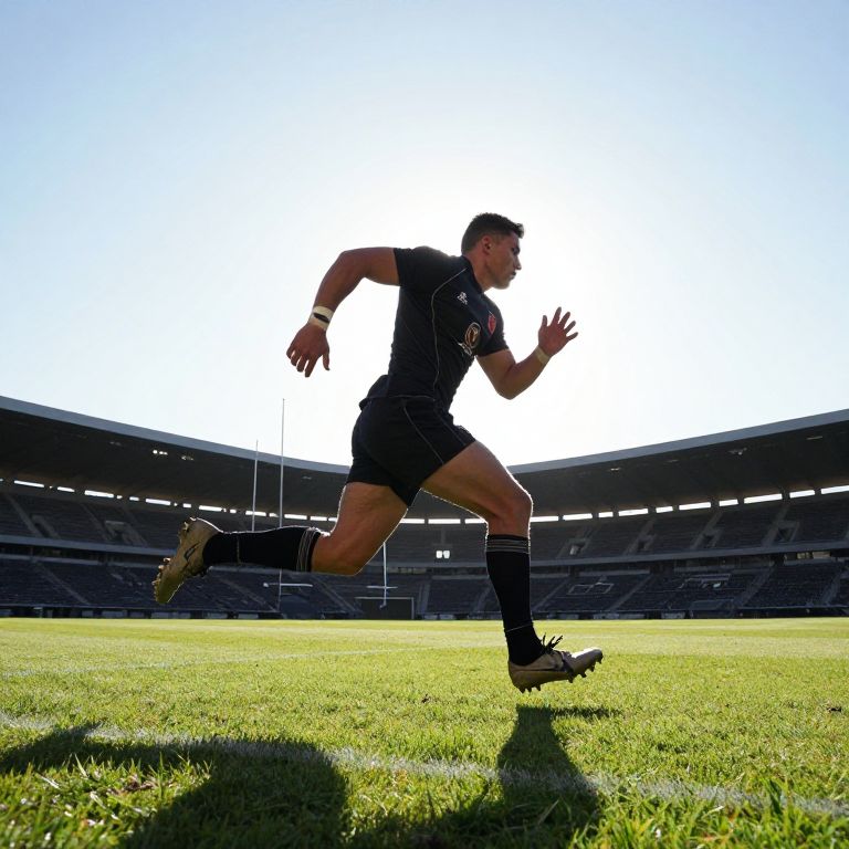 Photograph of a male rugby player in black uniform, mid-sprint on a sunlit grass field, with a large stadium backdrop.