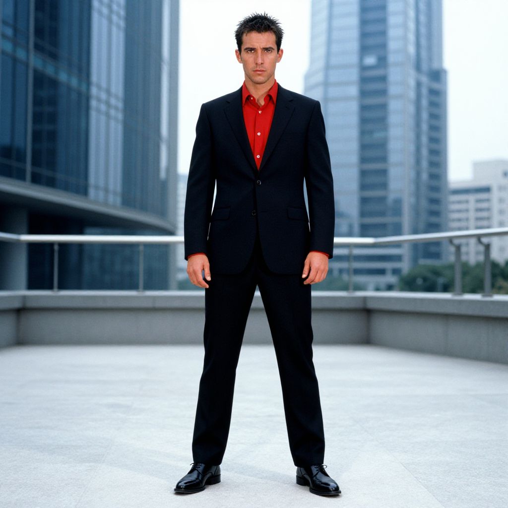 A man, black tailored suit, vibrant red dress shirt, polished black leather shoes, modern glass buildings, ektachrome film stock, confident expression Man has masculine face and piercing eyes