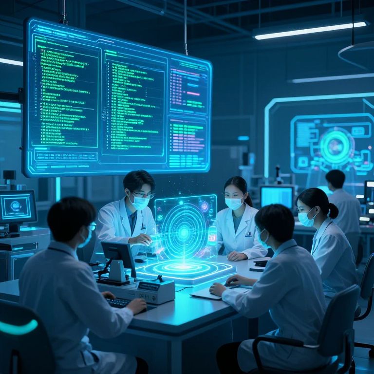 Photograph of six Asian scientists in white lab coats, working in a futuristic, blue-lit AI research lab with holographic screens.