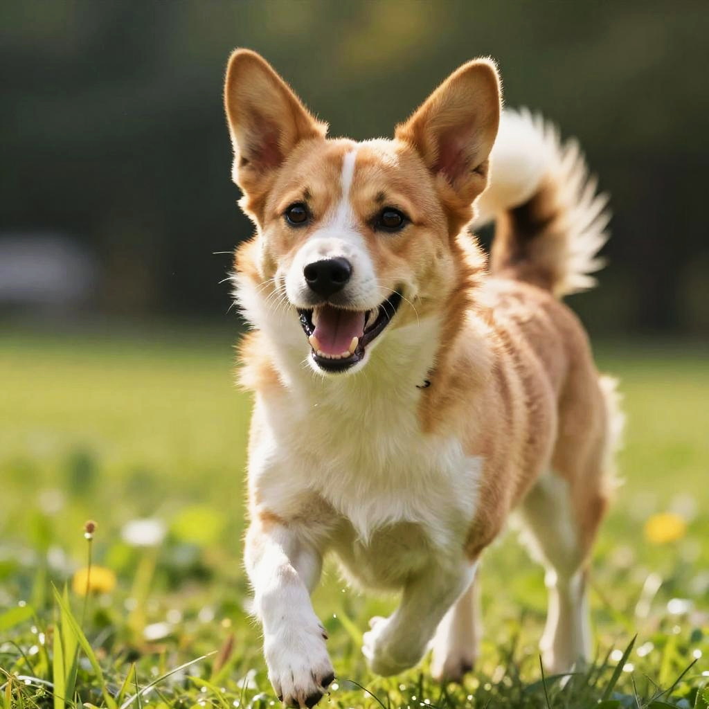 Close-up of a dog named Ollie playing in a lush green park, joyful expression, mid-jump with ears flapping, sunbeam highlighting fur texture, playful and lively mood, vibrant nature elements surrounding the scene.
