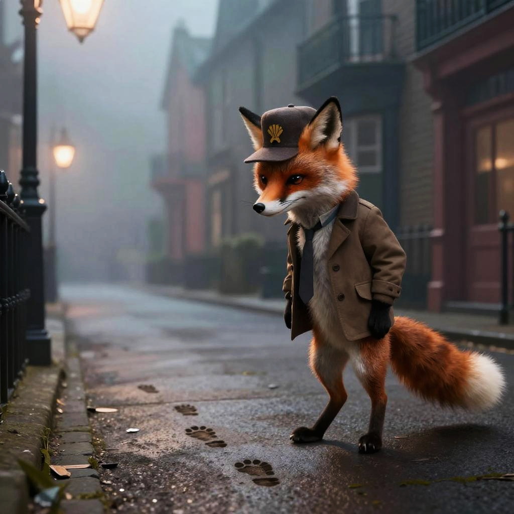 Lowbrow art of a clever fox detective inspecting footprints, influenced by Mark Ryden, with a foggy Victorian street at night, soft lighting, whimsical and surreal