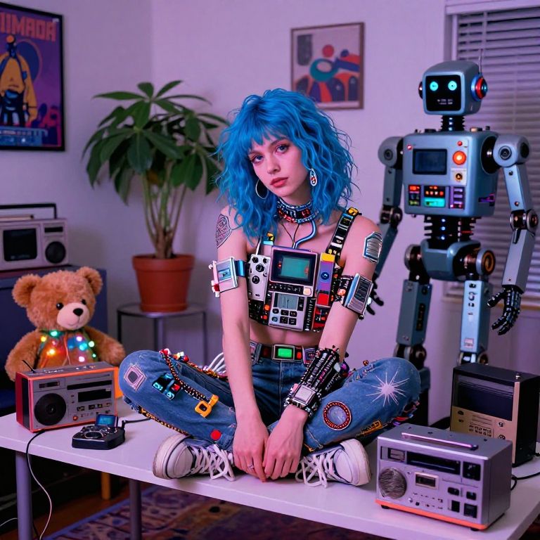In a 90's New York grungey apartment, a person with striking blue hair sits cross-legged on a table, adorned with a futuristic, tech-inspired outfit made from computer parts. The room is filled with an eclectic mix of objects: a robot-like figure stands to the right, a potted plant adds a touch of greenery, and a teddy bear with glowing lights adds a whimsical touch. A radio and various electronic devices are scattered around, hinting at a tech-savvy environment. The overall composition is dynamic, with objects and colors interacting in a visually engaging manner, evoking a sense of the cyberpunk era.