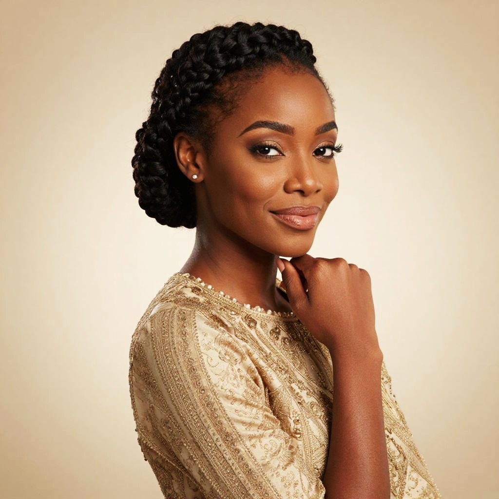 Elegant black woman with a crown braid hairstyle, vintage-inspired outfit, softly glowing background, gentle smile, refined and graceful posture, detailed and realistic style