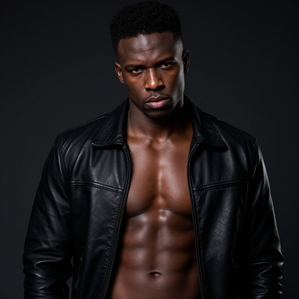 Photograph of a muscular, dark-skinned Black man with short, curly hair. He's wearing a black leather jacket, unzipped to reveal his chest and defined abs. His expression is serious, with a slight squint in his eyes. The background is a solid, dark gray, making him the focal point. The lighting highlights his smooth, shiny skin and the texture of the leather jacket.