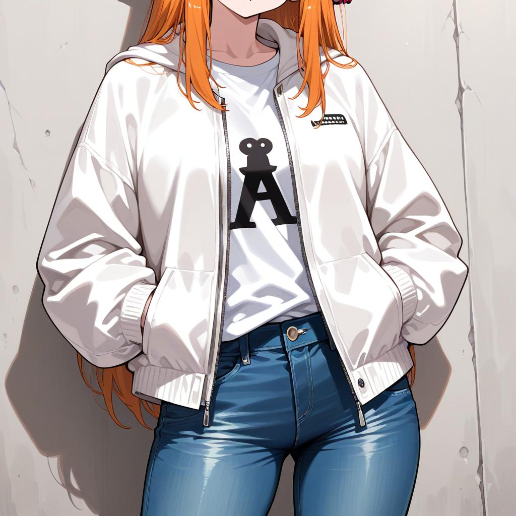 Digital illustration of a female anime character wearing a white zip-up jacket over a white t-shirt with a black emblem, paired with tight blue jeans. The character has long orange hair covering her ears and her hands are tucked into the jacket pockets. The background features a plain, slightly textured concrete wall.