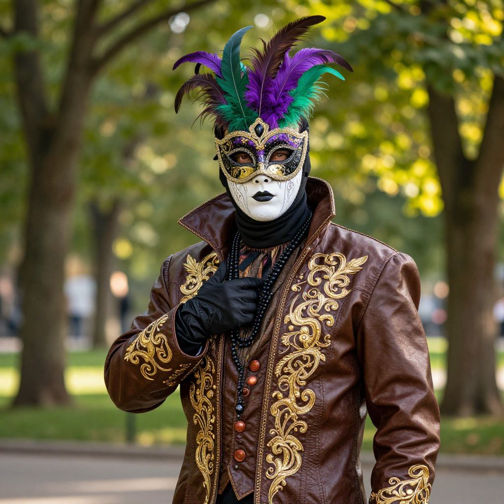 Photograph of a masked figure in an ornate brown jacket with gold embroidery, black gloves, and colorful feathered mask in a park.