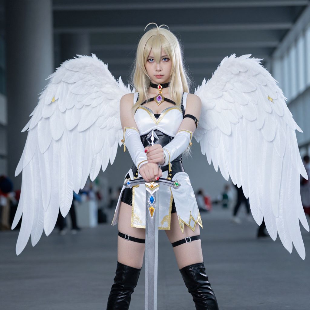 Eros cosplay, woman in a cosplay outfit with wings and a sword