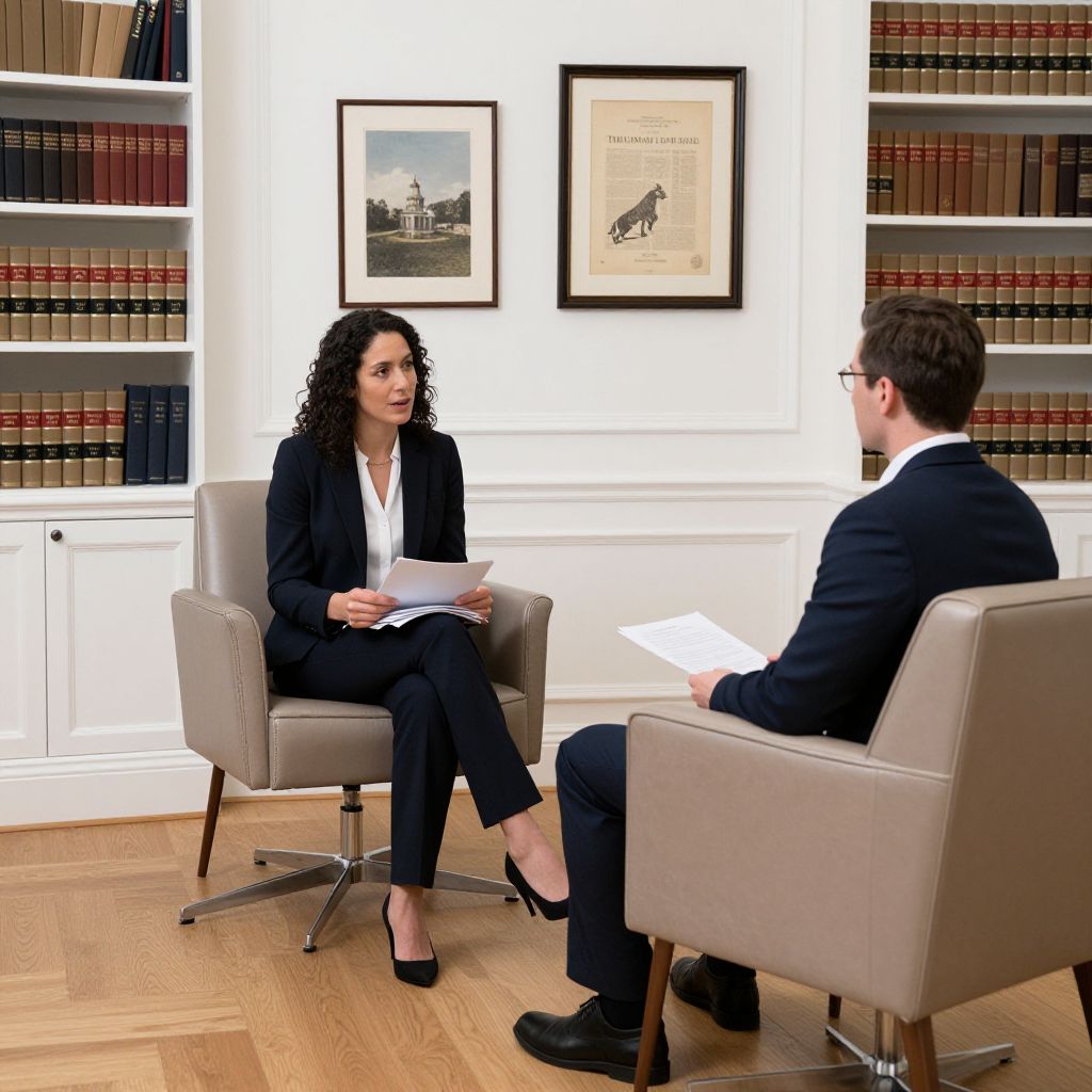 An authentic interior scene of a private law office with Eastman LLP style—light oak flooring, white walls with subtle paneling, and large bookshelves displaying legal texts and vintage art. A woman in her late 30s with dark curly hair and a composed facial expression sits across from a partner in a modern leather chair, engaged in a focused conversation with a stack of case files in front of them.