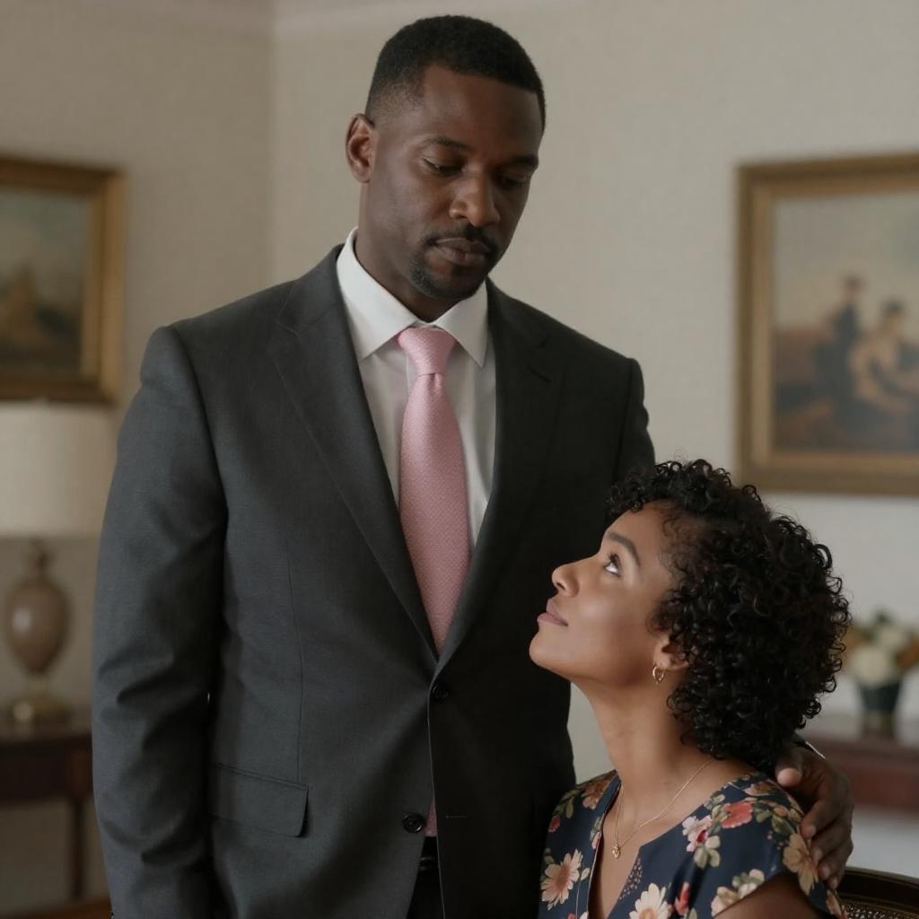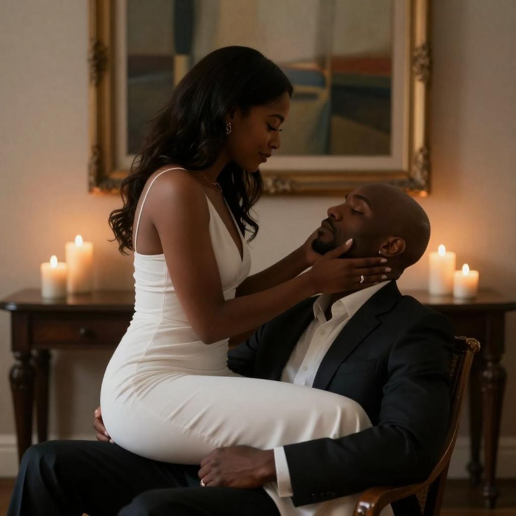 African-American woman with long dark hair, wearing a white dress, straddles a reclined African-American man with a bald head, dressed in a dark suit, in a candlelit room. She touches his face gently. Candles on a table behind them. Warm light. Framed abstract painting on the wall. Man's eyes closed, woman's eyes focused. Soft, intimate atmosphere.