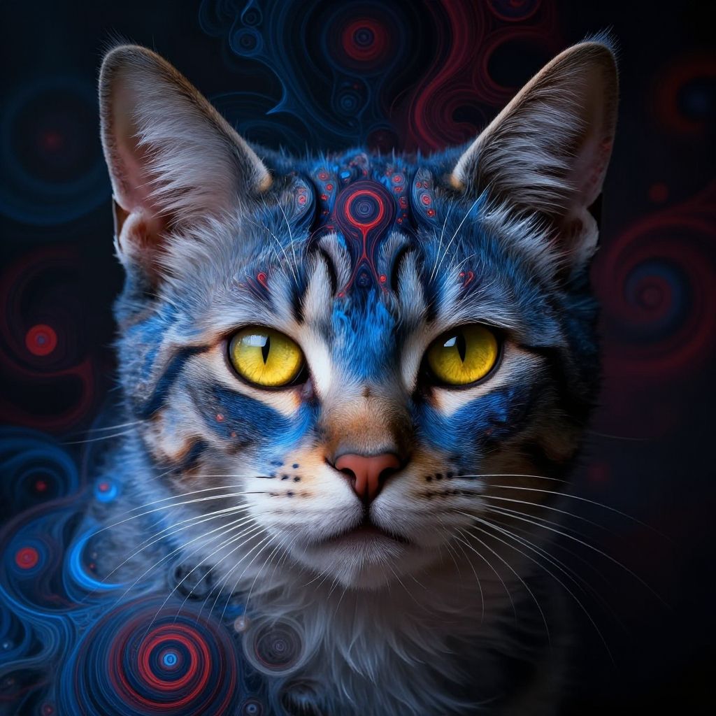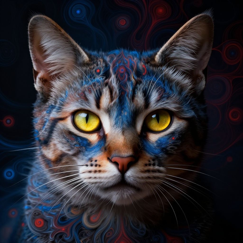 Digital artwork of a blue-patterned, large-eared cat with glowing yellow eyes, set against a swirling, abstract background with red and blue patterns.