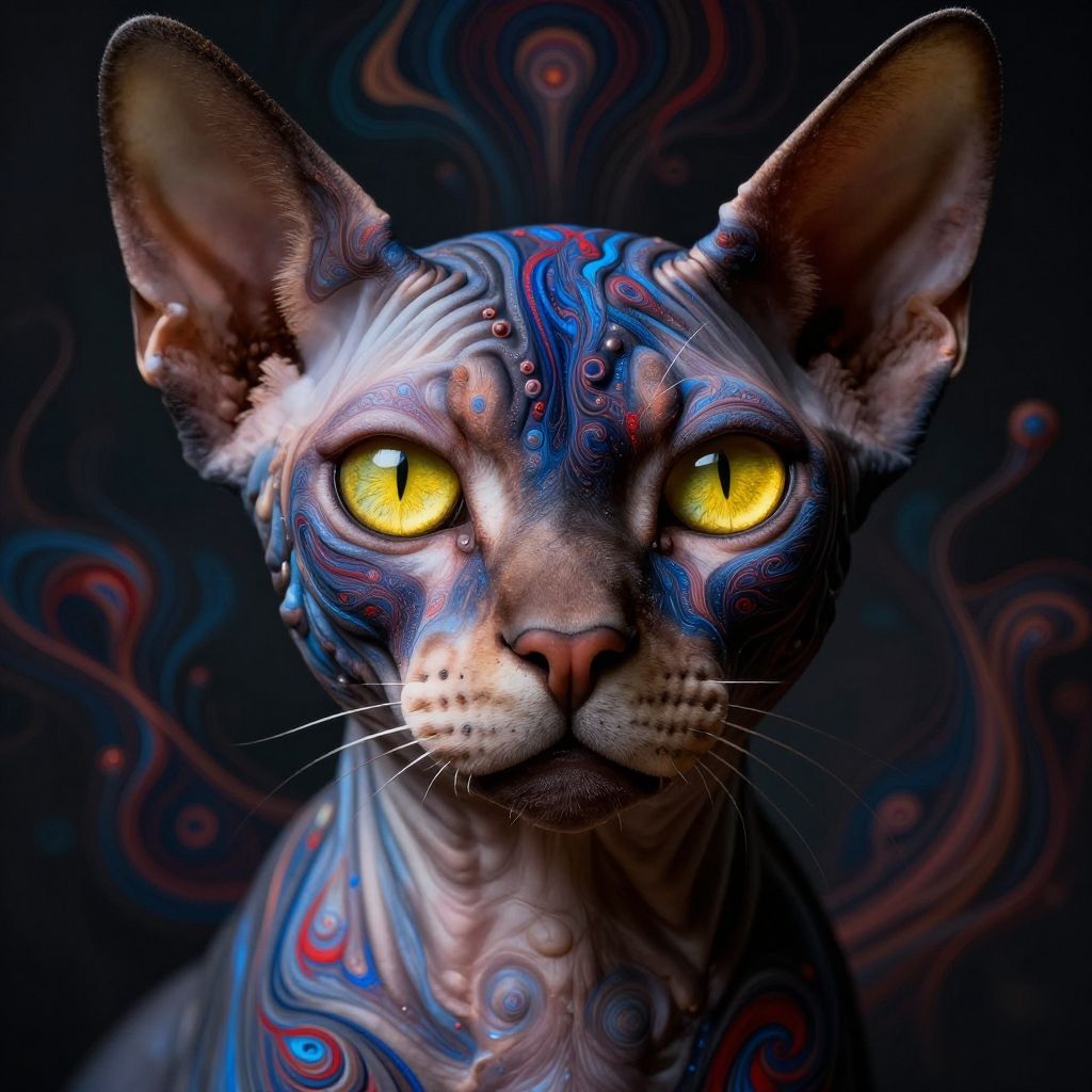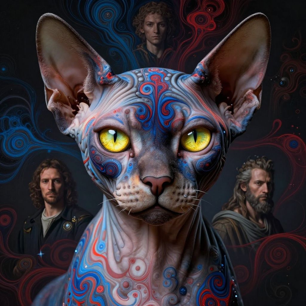 Portrait of french princess royale sphynx, yellow piercing eyes, chaos design, blue and red fractal, closeup, showcasing the determined spirit of the cat, multiples layers, hyper detailed, hyperrealism, high detail, high quality, high resolution, dramatically captivating, perfect composition, beautiful detailed intricate insanely detailed octane render, trending on artstation, 8K, artistic, concept art, soft natural volumetric cinematic perfect light, chiaroscuro, award - winning, masterpiece, raphael, caravaggio, greg rutkowski, beeple, beksinski, giger, detailed background