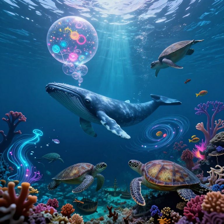 Vibrant underwater scene: massive whale swimming with iridescent bubbles, colorful fish, sea turtle, and coral reef, bathed in sunlight.