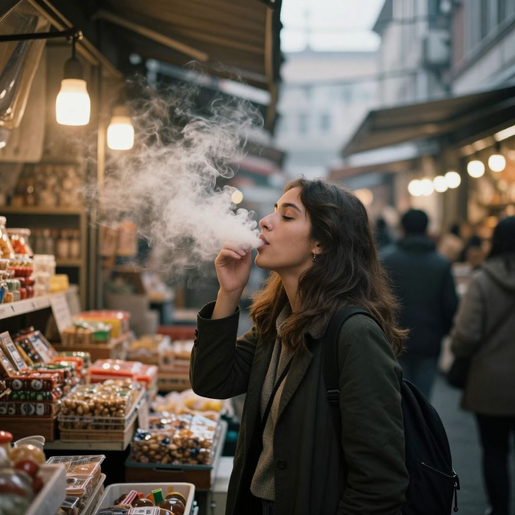 Smoke billows from a woman's mouth as she exhales in a bustling marketplace, surrounded by shelves stocked with goods and illuminated by warm, ambient lights, creating an ethereal atmosphere where vaporized sensations seem to intertwine with the urban environment.