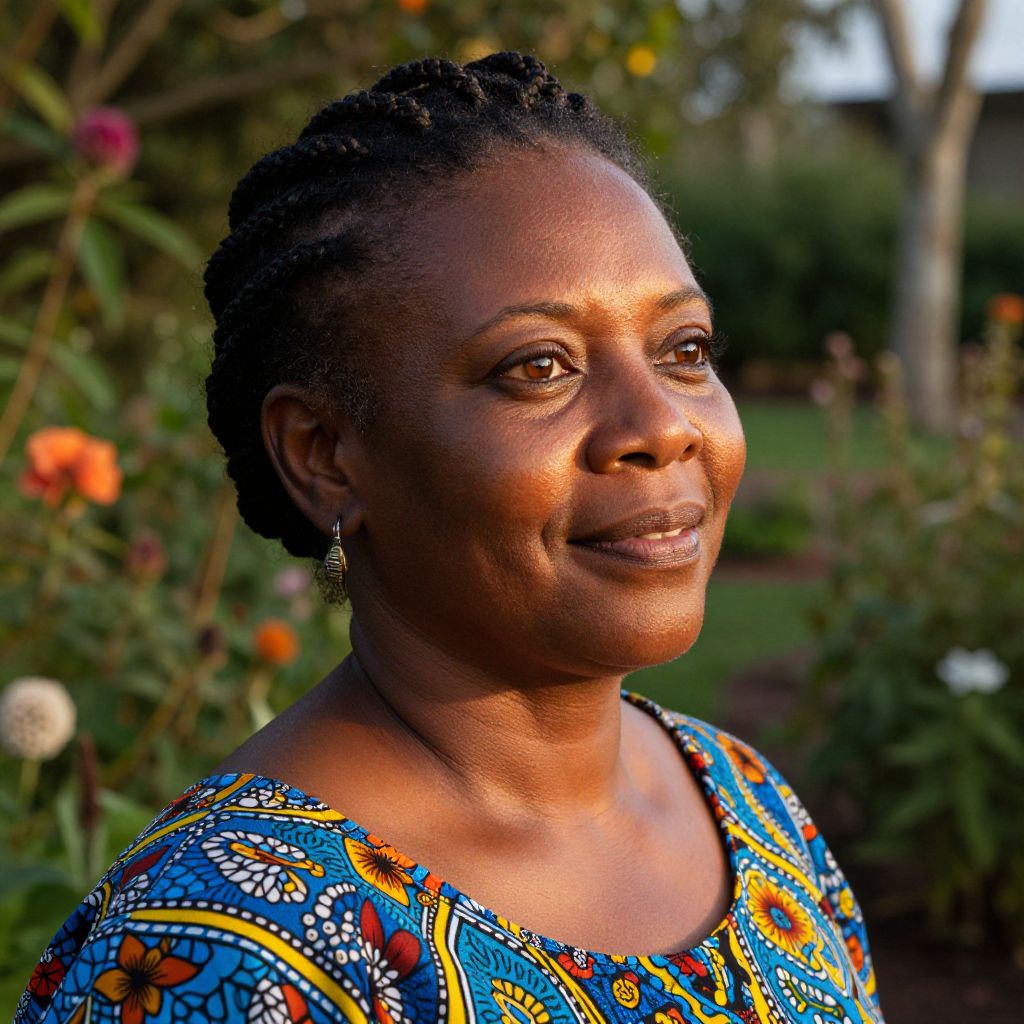 Photograph of a smiling African woman with dark skin, braided hair, wearing a colorful, patterned dress, standing in a garden.