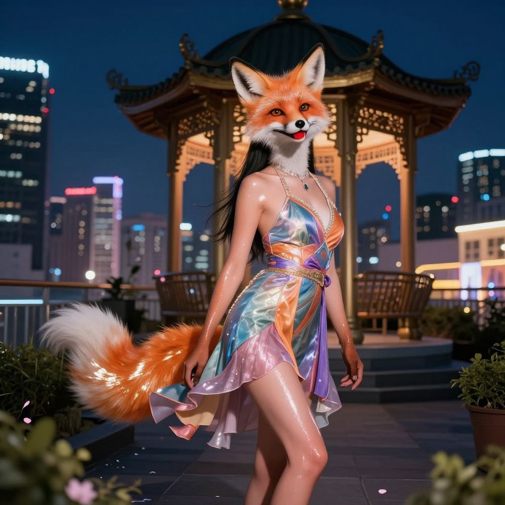 Miaokapvc, best quality, ultra detailed, realistic, shiny_skin, On a rooftop garden in a bustling city, the fox spirit stands beside an art deco-style pavilion, her fox ears remaining vigilant amidst the urban clamor. Her tail shines with a dazzling luster under the city lights, gently swaying with her light steps on the rooftop. Her dress is in the fashionable colors of the city, complementing the modern architecture around her, with the hem billowing in the night wind, revealing her sensual figure. Her eyes show curiosity and exploration of the city, her red lips slightly parted, as if savoring the prosperity and charm of the metropolis. Petals shimmer around her under the lights, and she appears as a fashionable goddess of the city, sensual and full of energy., figure