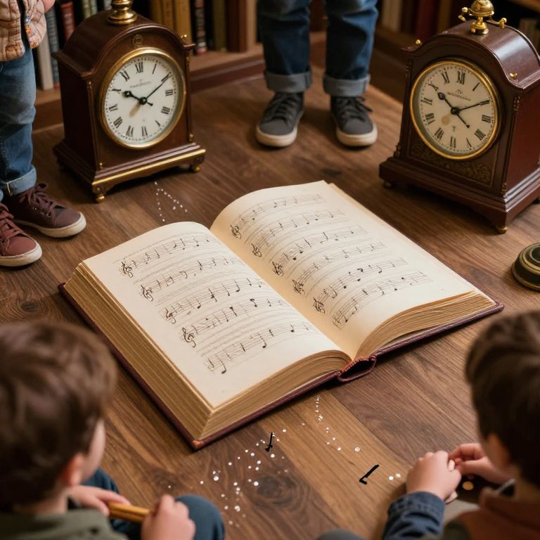 A librarian made of ancient clocks reads a living book that breathes in time with the pulse of its curious audience, whose feet leave trails of tiny musical notes where they stand.