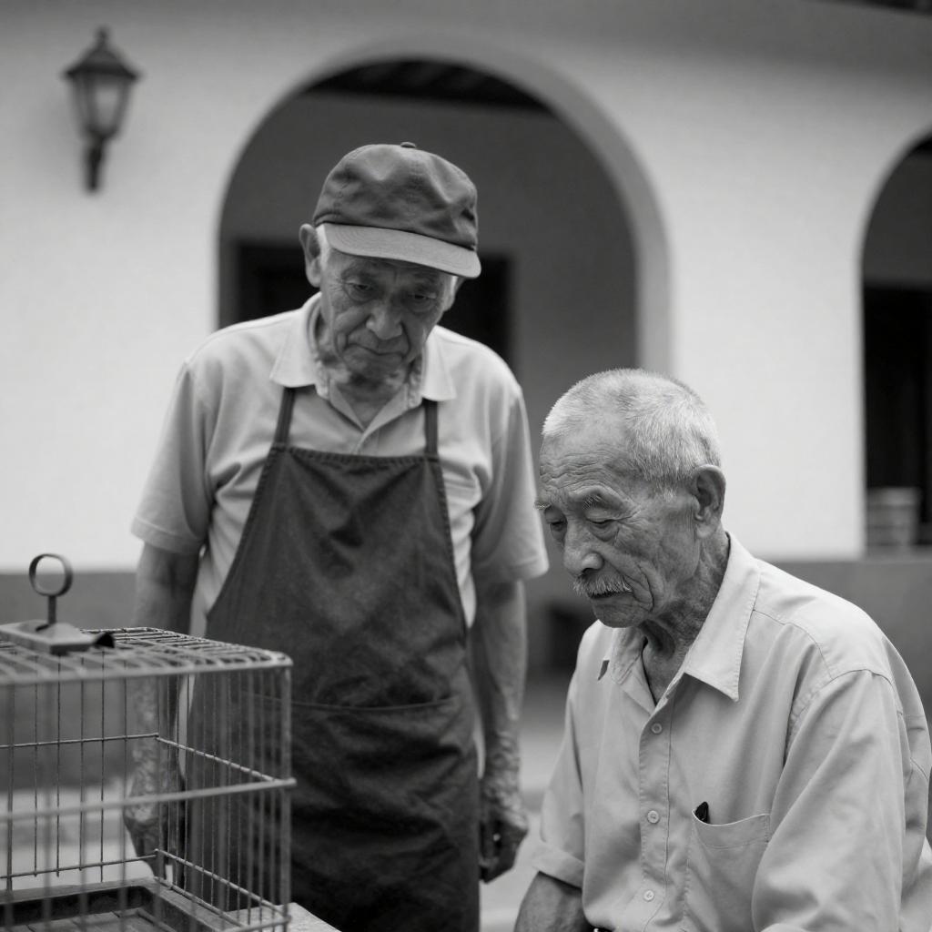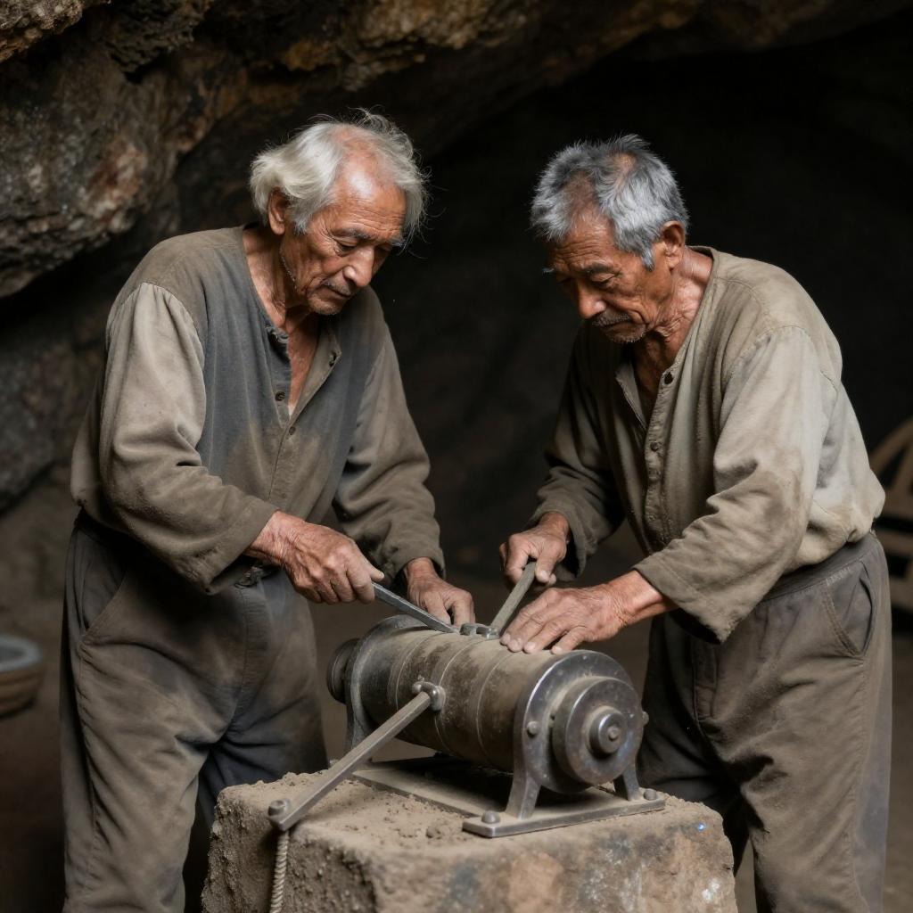 Two elderly men with dirty, worn clothes in a dimly lit, dusty cave. They work on a large, cylindrical metal object with levers and pulleys. One man has long, white hair, the other has gray hair. Both are focused and intense.