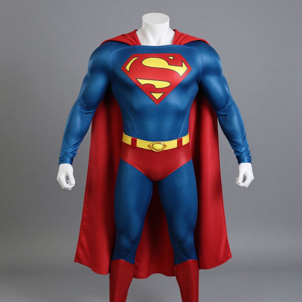 Photograph of a mannequin dressed as Superman. The costume features a blue, textured bodysuit with a large red "S" emblem on the chest, red trunks with a yellow belt, and red boots. A red cape with a yellow trim hangs from the shoulders. The mannequin has a white, featureless head and hands. The background is a plain, gradient gray. The costume is highly detailed, with a shiny, almost metallic texture on the blue bodysuit, and a smooth, fabric-like texture on the cape and trunks.