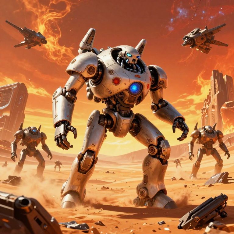 A vivid CGI scene depicts a futuristic desert battlefield under a fiery, orange-red sky. At the center stands a massive, silver robotic warrior with glowing blue and red eyes, four arms, and intricate mechanical details. Surrounding it are four smaller, similarly designed robots. The ground is dusty, with scattered debris and destroyed structures. In the background, two flying robots hover amidst dramatic, swirling clouds. The scene is dynamic and intense, with a strong contrast between the metallic robots and the vibrant, fiery sky.