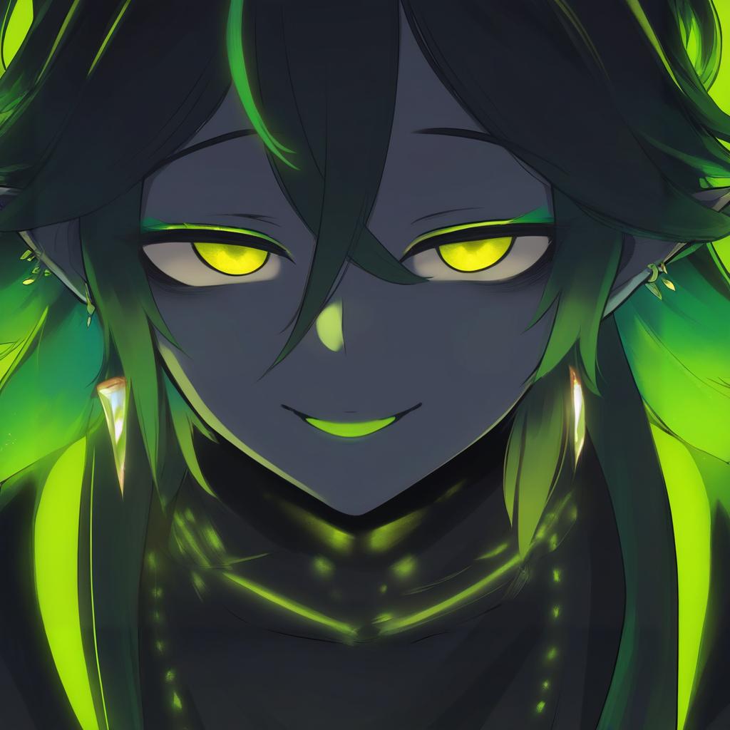 Hanabatake chaika, nijisanji, 1boy, green lips, pointy ears, yellow eyes, green eyeshadow, black hair, green hair, long hair, gradient hair, folded ponytail, virtual youtuber, virtual youtuber, earrings, elf, lipstick, by artist null (nyanpyoun), leet