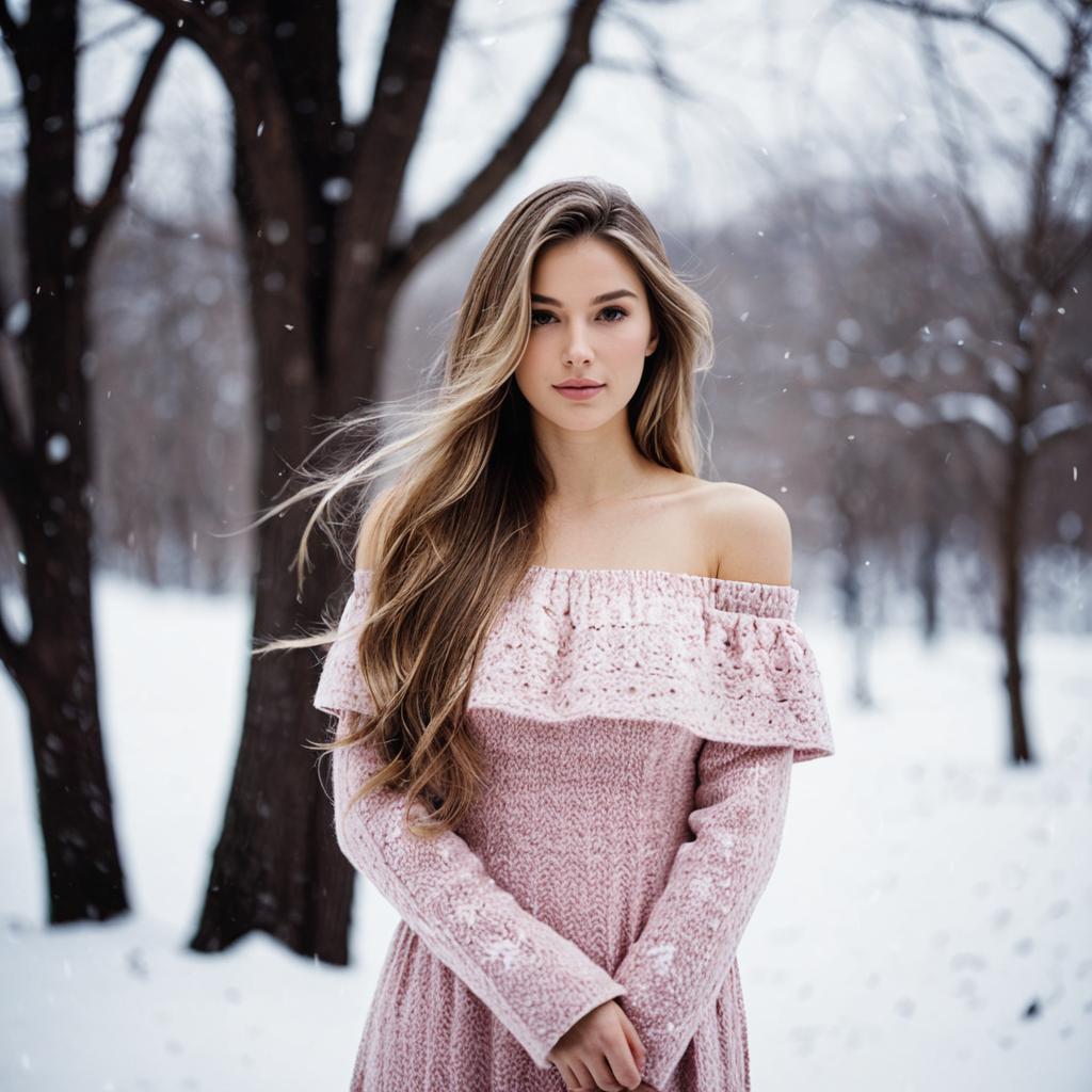 Beautiful winter dress,1girl, solo, long hair, dress, realistic, brown hair, looking at viewer, tree, bare shoulders, blurry background, blurry, off shoulder, pink dress, outdoors, snow, lips, blonde hair