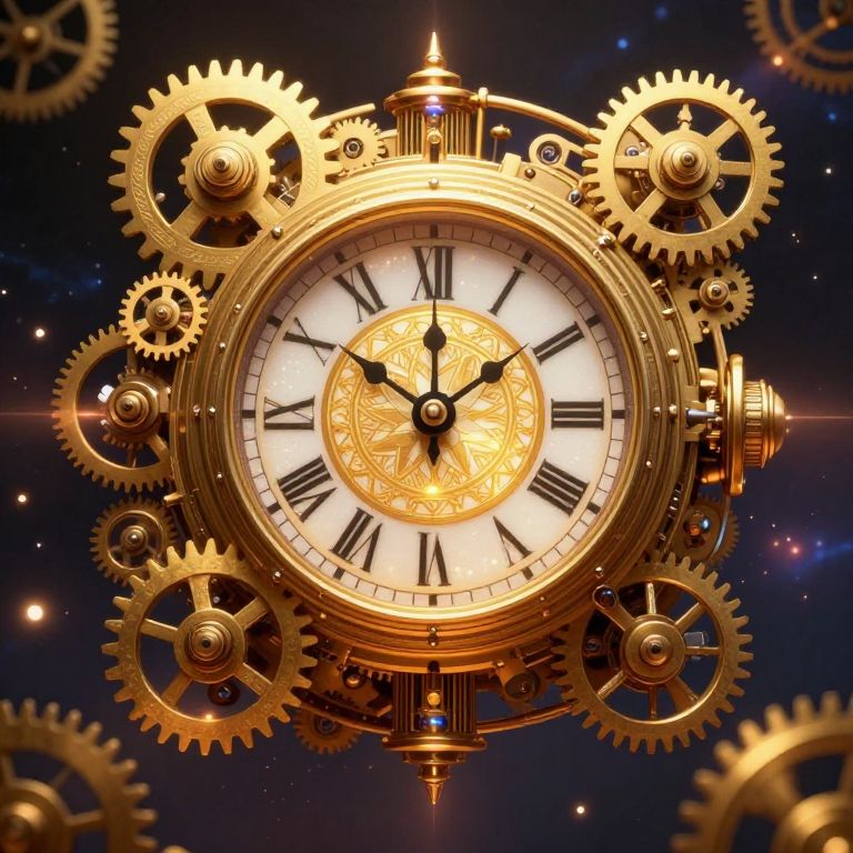A steampunk masterpiece of golden gears and radiant sigils hums with otherworldly energy, its central clock face counting the passage of time amidst a cosmic ballet of mechanical wonder.