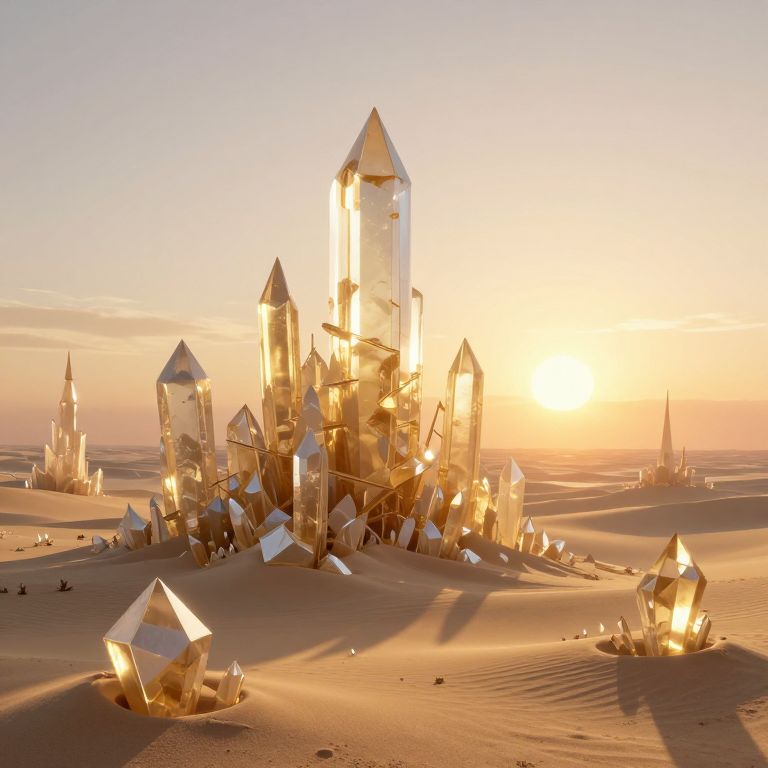 This is a CGI-rendered image of a futuristic, crystalline city set in a vast desert at sunset. The city is composed of numerous towering, transparent, glass-like crystal structures that reflect the warm, golden light of the setting sun. The crystals have sharp, geometric shapes and are arranged in a cluster, with some smaller crystals scattered around the sandy terrain. The background features a serene, expansive desert with soft, rolling dunes extending to the horizon. The sky is a gradient of warm oranges and pinks, enhancing the ethereal, otherworldly atmosphere of the scene.