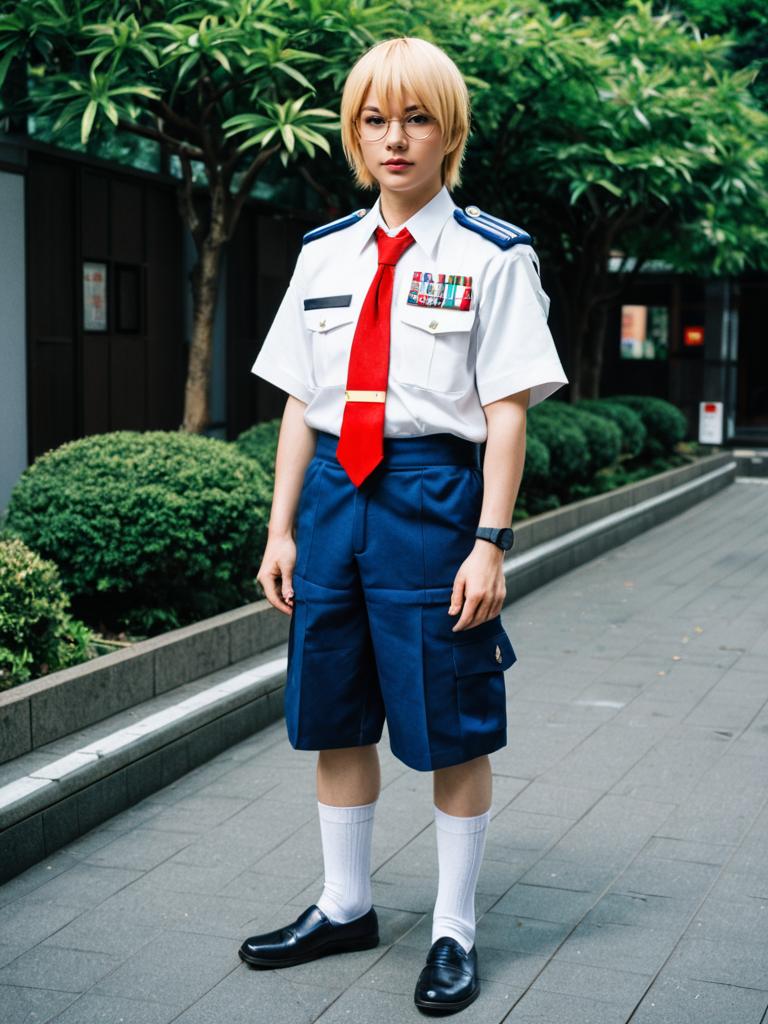 Photo-realistic cosplay photo of person in hakata toushirou costume. Full body. Standing. Full length. 1boy, blue eyes, red-framed eyewear, glasses, blonde hair, military uniform, military uniform, shorts, necktie, tantou